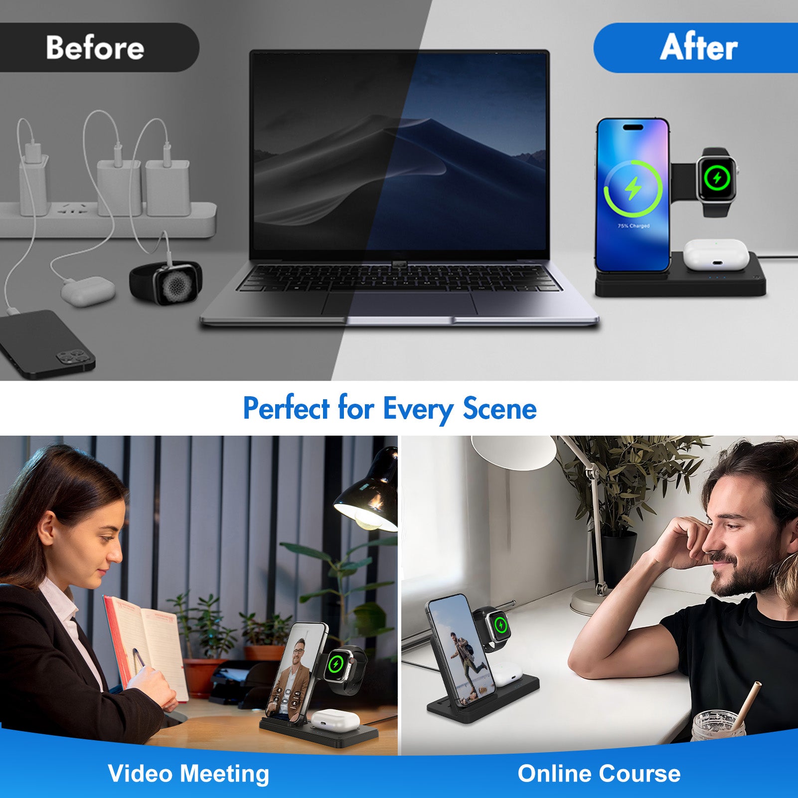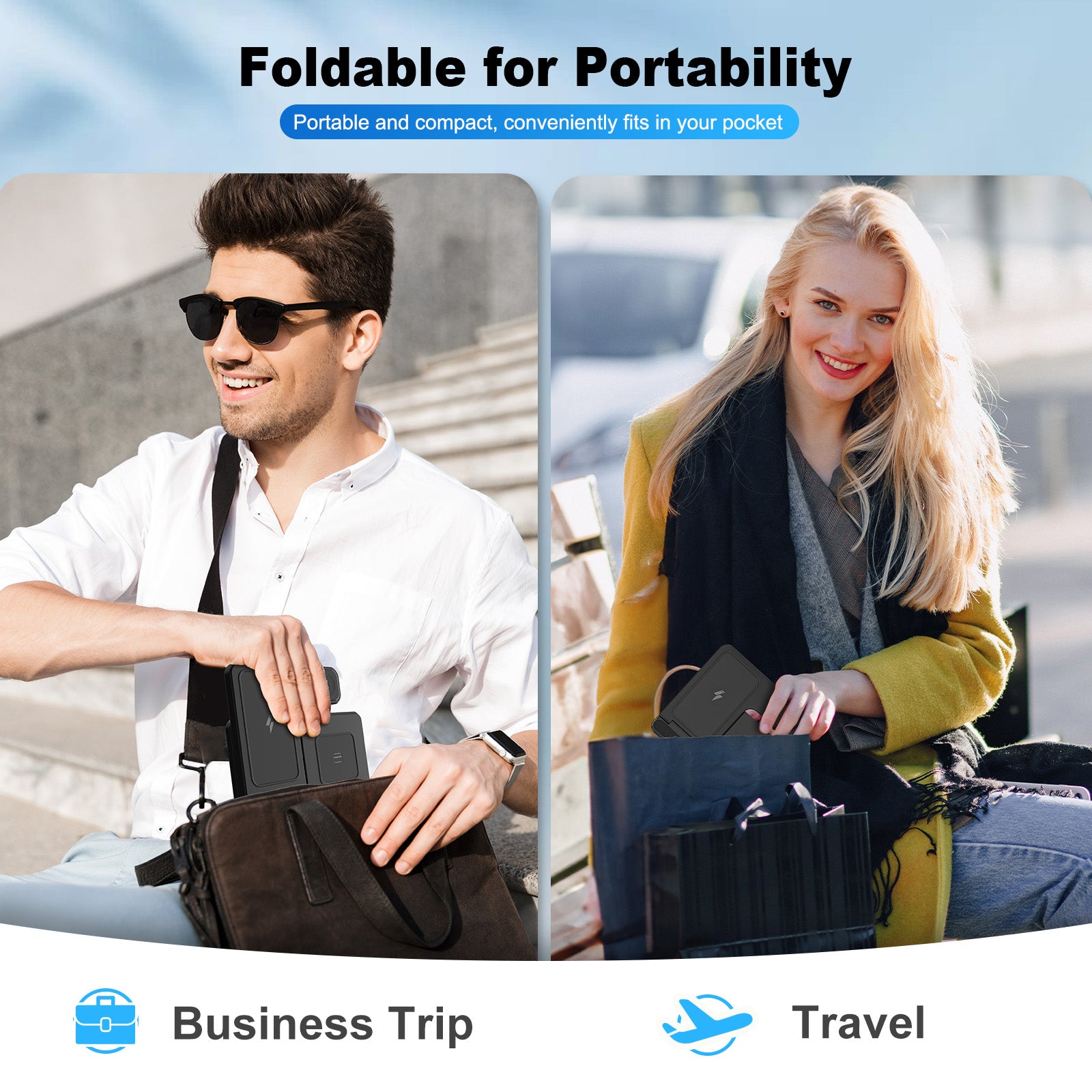Portable & Foldable Stand Design: The wireless charging station is foldable, lightweight, and portable, and can be put in a bag or suitcase. This wireless charging stand is not only a great choice for home and office use but also for travel and business trips.